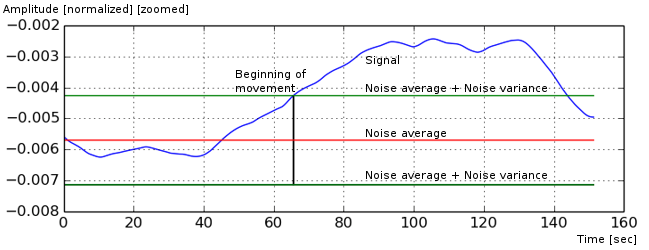 To detect the beginning of the movement, we supposed that the noise always has the amplitude which is smaller than the movements' amplitudes. We have calculated an interval outside of which the signal can be considered as the movements.